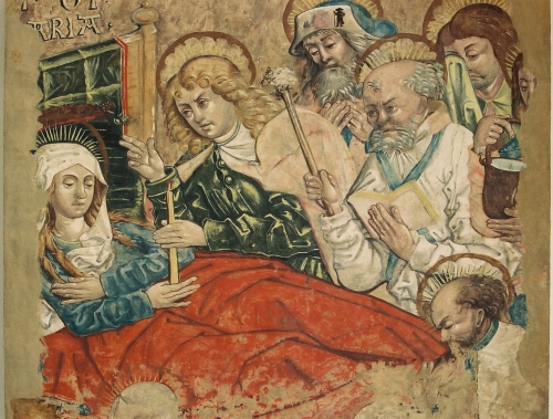 Na její severní straně byla někdy kolem roku 1500 vytvořena nástěnná malba (pravděpodobně šlo o motiv Nanebevzetí Panny Marie o celkové ploše 20 m2), ze které je nám znám pouze fragment výjevu smrti Panny Marie, který je považován za jeden z nejlepších příkladů moravské gotické nástěnné malby. Malba souvisí i s patronem kaple svatým Janem Evangelistou, který je zde vyobrazen, jak podává nebo odebírá svíci Panně Marii. Zdůrazněna je i postava apoštola Petra a Jakuba v cestovním klobouku s odznakem, což odpovídá poloze kostela na svatojakubské poutní cestě. Kompozice byla realizována podle rytiny německého grafika Martina Schongauera a jejím objednavatelem byl vincourský cech, který v té době držel patronátní právo nad oltářem; od roku 1532 jsou jako patroni kaple uváděni hustopečští radní.